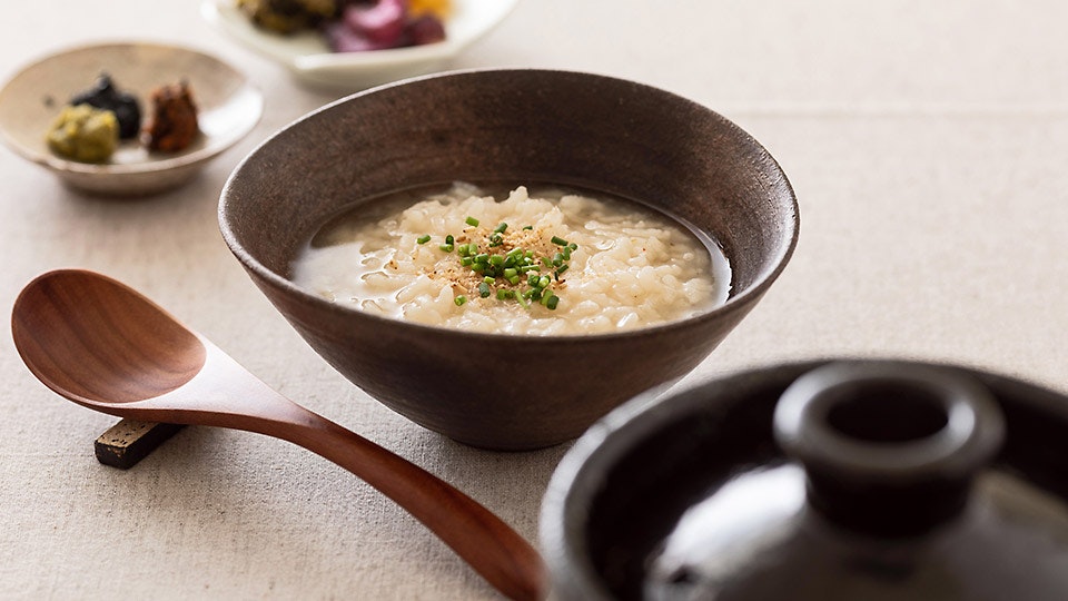 生姜・陳皮・唐辛子を使った鰹風味の「やさしい和漢だし」でつくるおかゆです。小さな土鍋で必要な分だけ。体があたたまるやさしい味わいです。