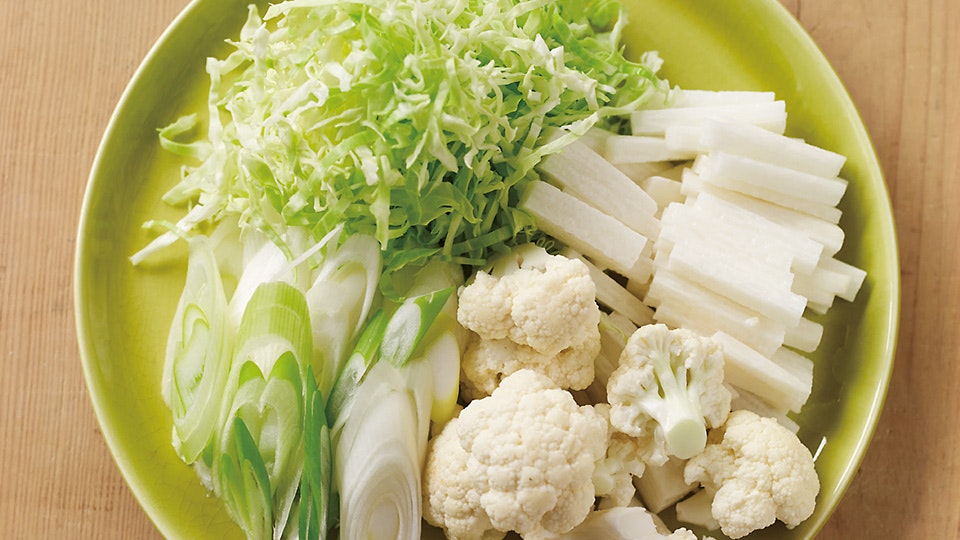キャベツ、白葱、山芋は細切りがおすすめ。山芋のシャキシャキ食感が残り、細切りのキャベツにはスープやチーズがよく絡みます。