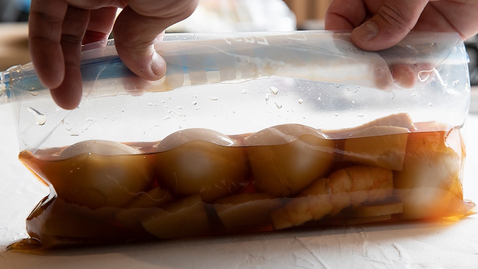 ②鍋で[B]を温めた後、保存袋で①の筍、車海老、卵を2時間程漬ける。