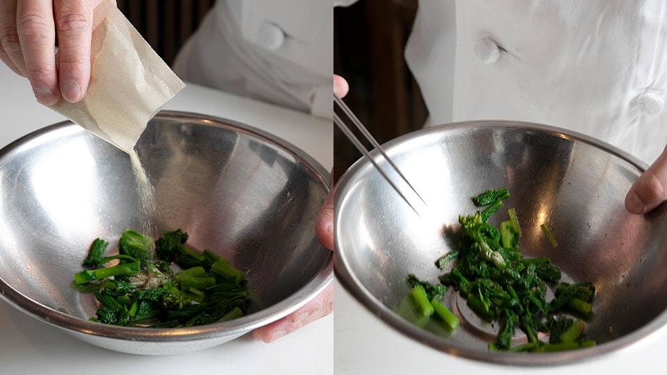 おだしにも浸さず、調味料も使わず、昆布だしをまぶすだけで菜の花の下味をつけます。真昆布や利尻昆布を用いた茅乃舎の昆布だしは、とっても繊細。品のよい味わいを叶えます。