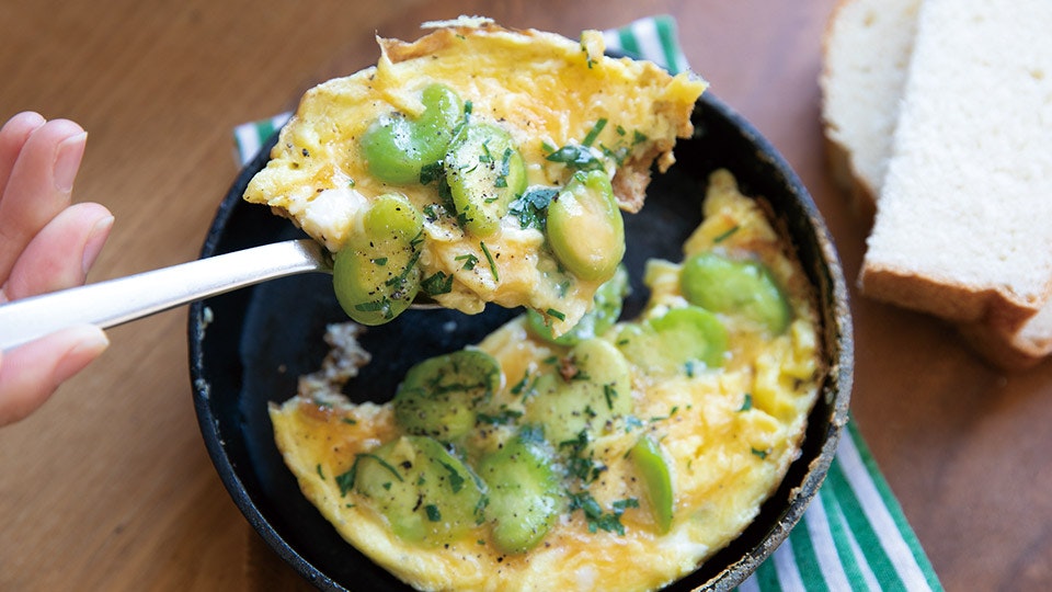 つくり方は、かんたん。袋を破ってお好みのだしを加えた卵を、スキレットのような小さめのフライパンに流し込み、茹でて皮を剥いた空豆を、上に乗せて焼くだけ。