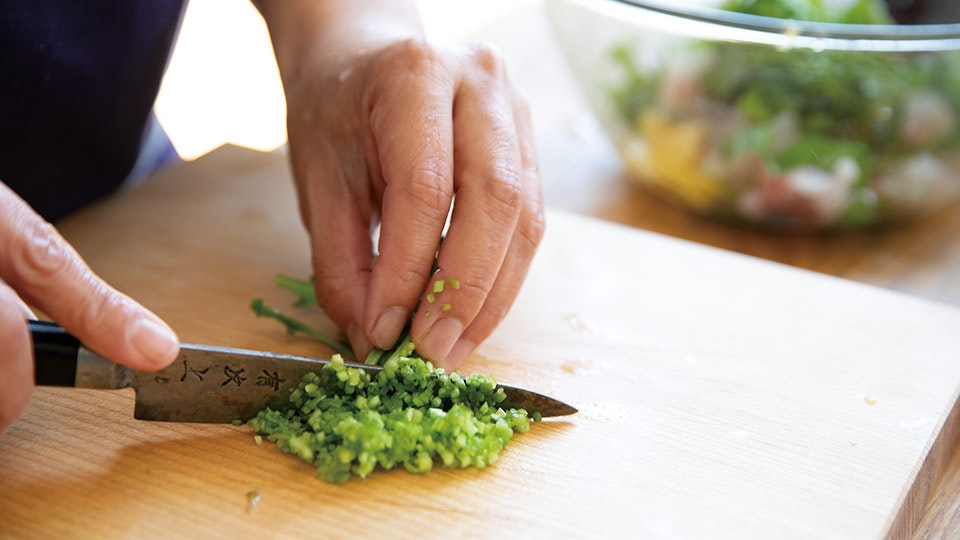 サラダに使った葉野菜は、ルッコラ、ワサビ菜、水菜。フェンネルなどのハーブのたぐい。「なんでもいいのですが、今日選んだのは、ちょっとクセがあるもの。アクが強すぎるものは、水にさらさないといけないけれど、さらしすぎないのもコツ。苦みがうまみだったりもするので。