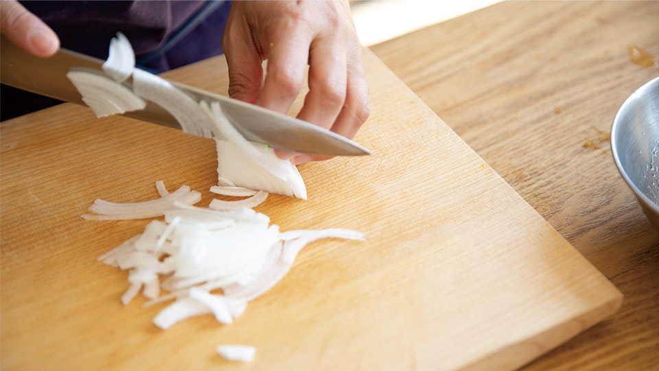 新玉ねぎを切るときのコツをうかがうと、最後のほうは倒して、もしくは上を外してから切るといいそう。