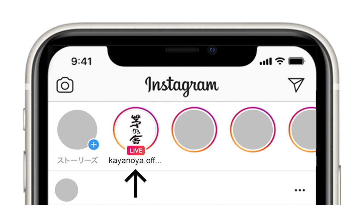 インスタグラムを立ち上げ、茅乃舎の公式アカウント(@kayanoya.official)をフォローいただき、トップ画面のアイコンをタップして視聴します。