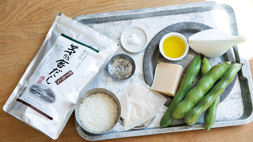 なんとなくハードルが高く感じて作ったことがなかったリゾット。広沢さんに教わると、コツさえ掴めばごはんを炊くより時短で良いかも!と思うほど身近なメニューになりました。ほくほくの空豆に、だしとチーズをまとったお米がよく合います。