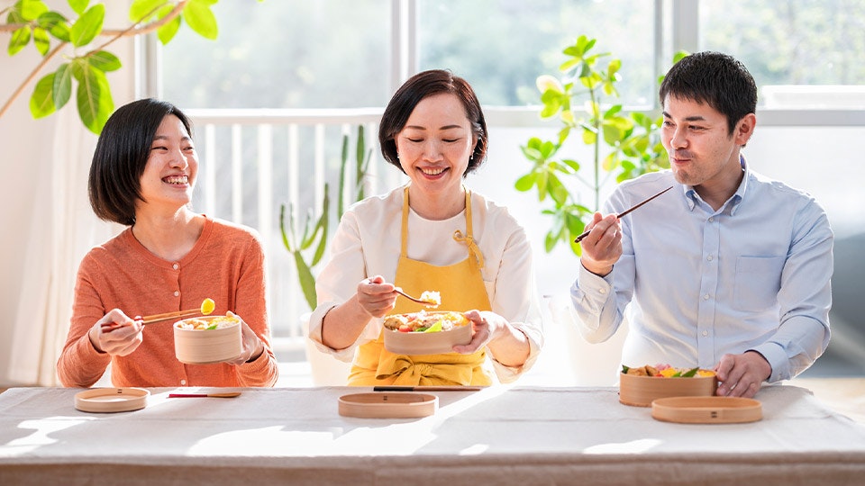 完成したお弁当をみんなでいただきます。蓋を開けると、優しい木の香りがふわり。