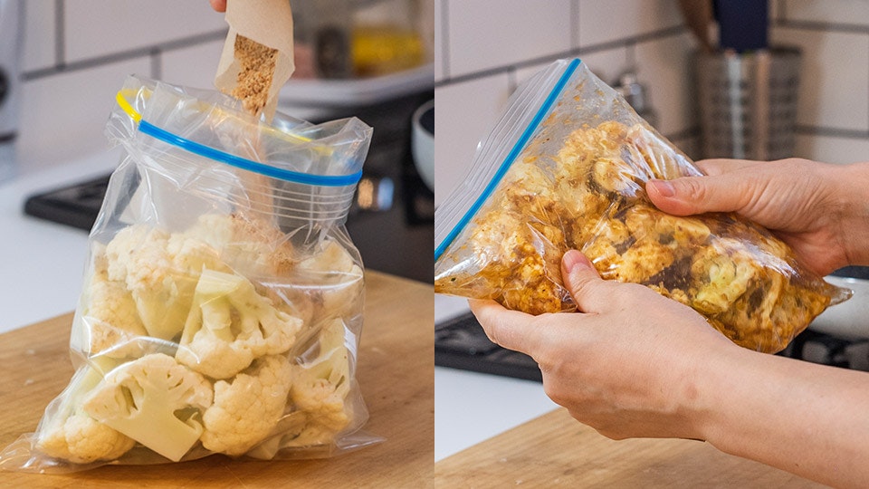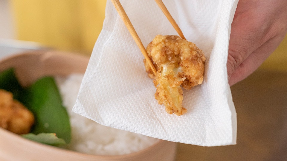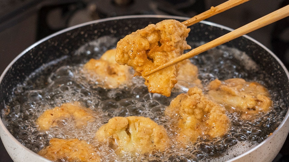 カリフラワーにしっかり下味をつけて、カリッと食感が楽しい唐揚げに。フライパンを使うので、揚げ油は少なめで。