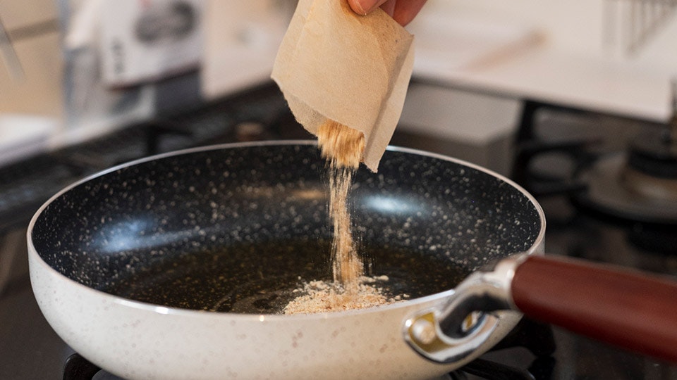 170℃は箸先を入れて泡が出続けるぐらいの温度。フライパンでの揚げ物は温度が上がりやすいので、始めは強めの中火で温度を上げ、その後は弱火にしましょう。