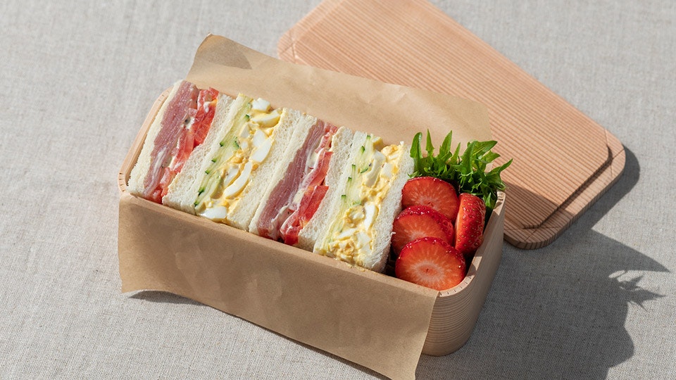わあ〜、曲げわっぱにサンドイッチって意外な組み合わせですが、四角のタイプだときれいに収まって、可愛い!