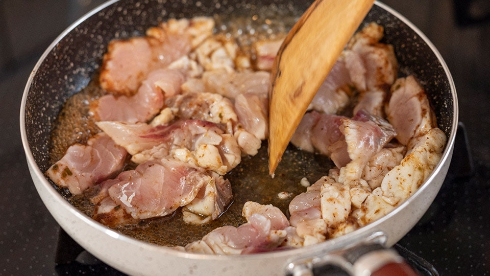 ③煮立ってきたら1㎝の厚さに切った鯛を入れて、ヘラでつぶしながら汁けがほとんどなくなるまで炒める。