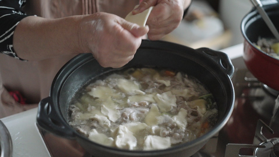①で作っておいた生地を、手のひらの上で薄くのばしながら、食べやすい大きさにちぎって汁の中へ。水餃子の皮くらい薄くのばすのが大木町流。だんごに火が通ったら、味噌を溶かして味つけしてできあがり。青ねぎを散らして食べる。