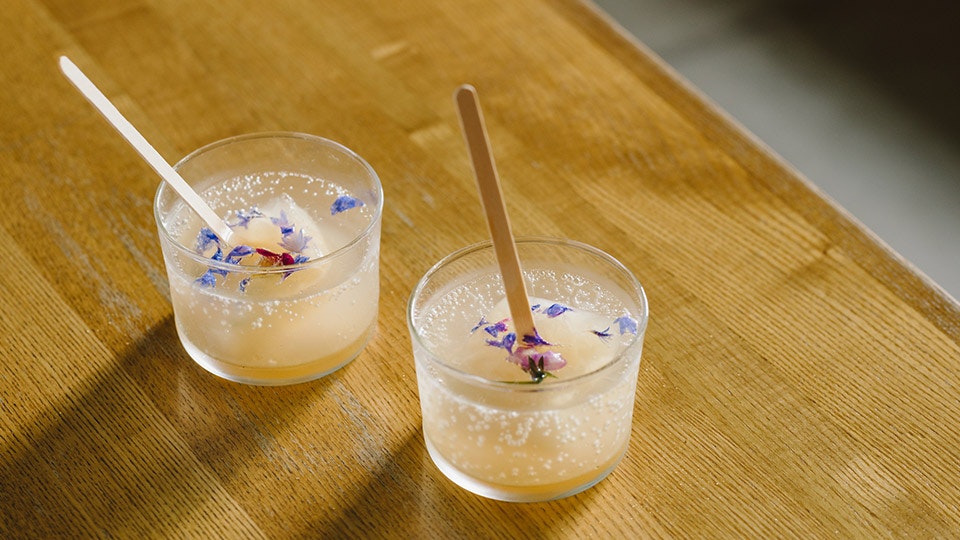 凍らせる時、アイスキャンディーのようにあらかじめ木の棒をさす。またエディブルフラワー(生食用花)を混ぜておくと、より場がときめきに満たされます。