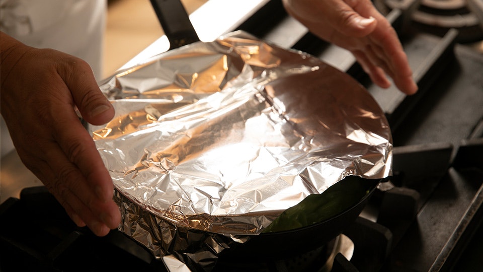 アルミホイルをかぶせて、余熱でチーズをとろりと溶かしていきます。