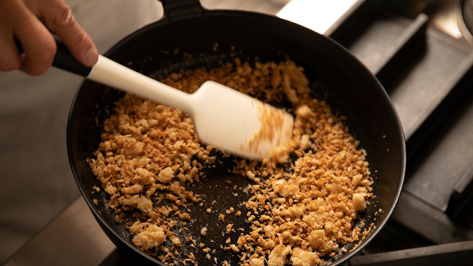 グラタンの上に最後に載せる焼きパン粉づくり。パン粉とバターを弱火で炒め、いい焼き色がついたらチーズを加えます。火が強いと焦げてしまうので、注意しましょう。