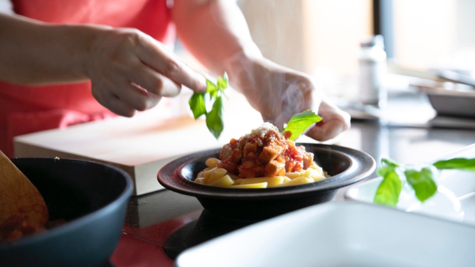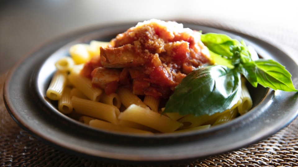 茹でておいたペンネを器に盛り、たっぷりのラグーをのせて完成。