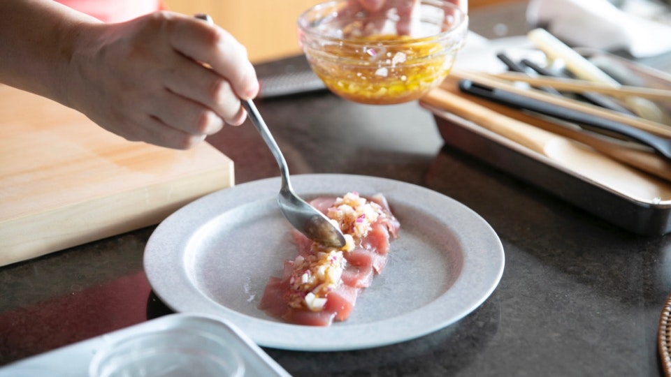 魚料理が苦手な方でも簡単につくれる「鮪のカルパッチョ」と「鮪のラグーソース」の2品です。