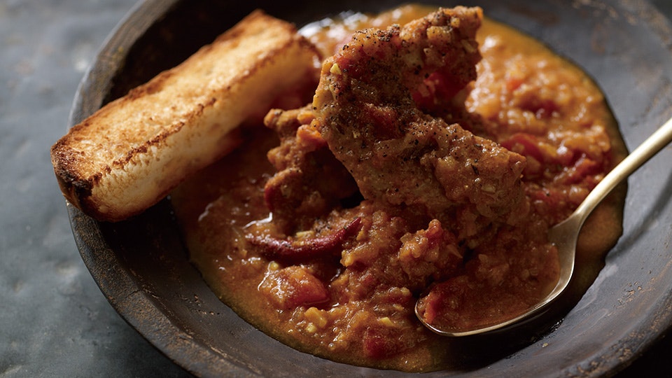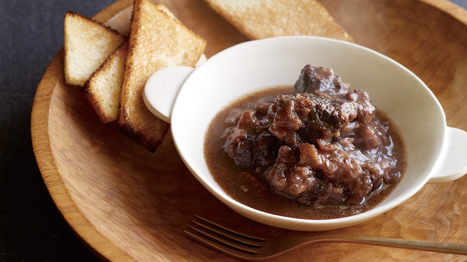 まずは、この色あいをご覧いただきたいのです。赤ワインを煮詰め、牛肉を別で焼いたあと、ホロホロになるまで煮込む。だからこそ生まれる、こっくり深い美しさ。そしてひと口食べれば、恍惚とともに、きっと確信につながります。「あぁ、やっぱりてまひまを惜しまずに作ってよかったぁ」と。ちなみにこちら、折々の会編集部でも「作ってみたい!」と一番人気でした。