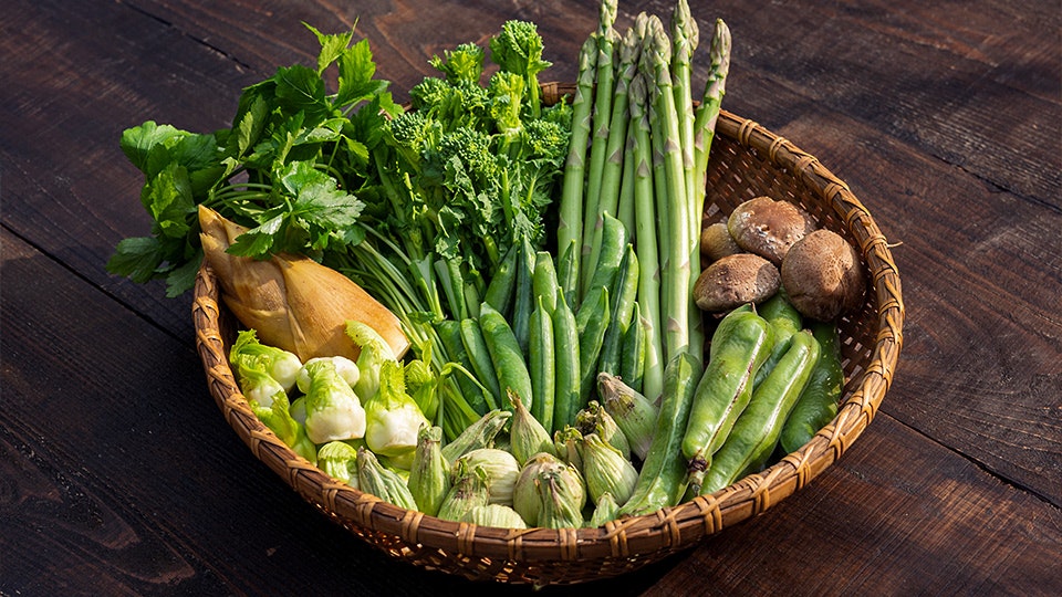 ふきのとう、筍、菜の花、豆類など。それぞれの個性が際立つ春野菜。尾﨑料理長曰く「私はふきのとう、つぼみ菜など少々苦味を感じるものが好きですね」。香りが高く、つややかな緑も美しい春野菜を五感で味わっていきましょう。