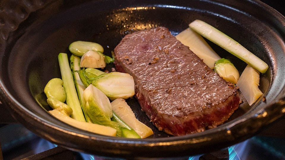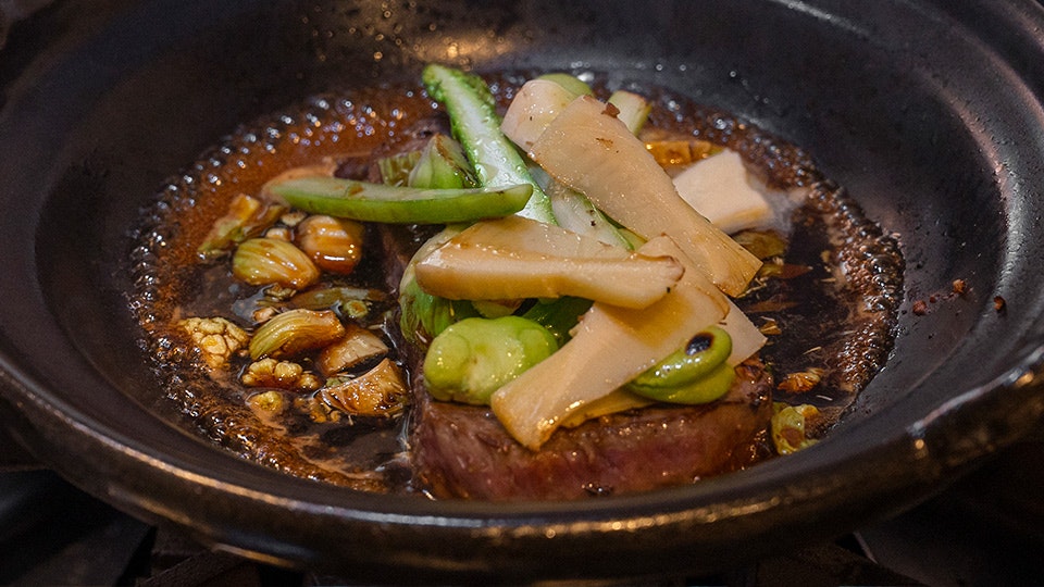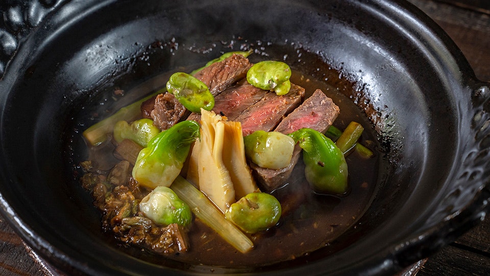「椎茸だし」をまぶして寝かせ、下味をつけた牛ロース肉。「土鍋九寸」の遠赤外線効果で表面は香ばしく、中はしっとり仕上がります。お肉を引き立てるのは、春の息吹を感じるふきのとうのソースです。