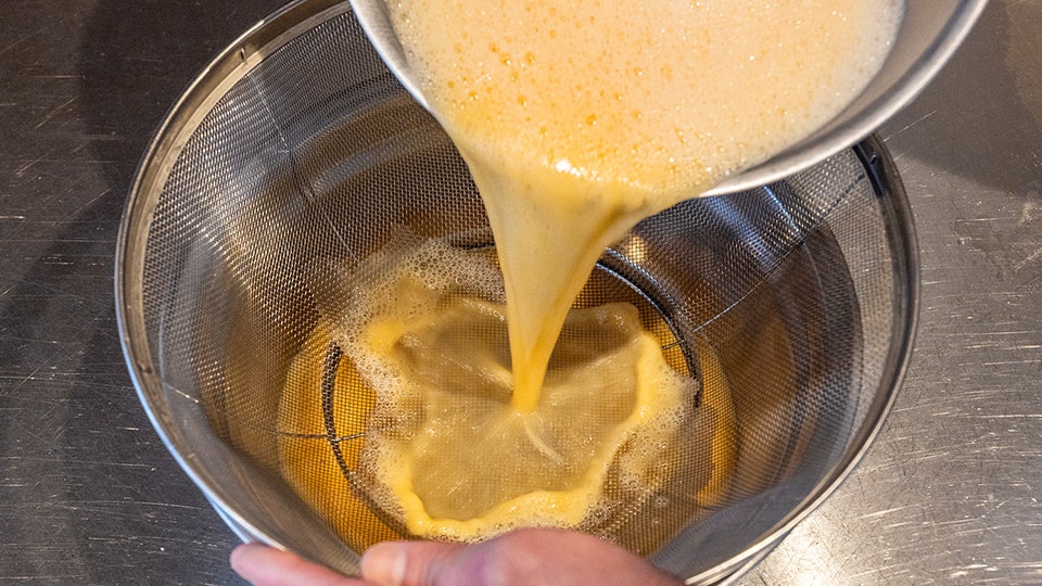 なめらかな触感の茶碗蒸しをつくるには、漉す手間をはぶかないことが大切です。ご家庭用のザルで十分漉せます。