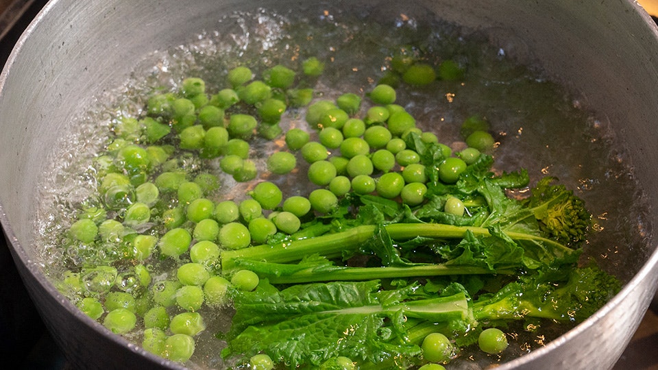 グリーンピースなど茹で時間が長い野菜から鍋に入れましょう。アスパラガスと菜の花は根元から茹で、先は最後に。
