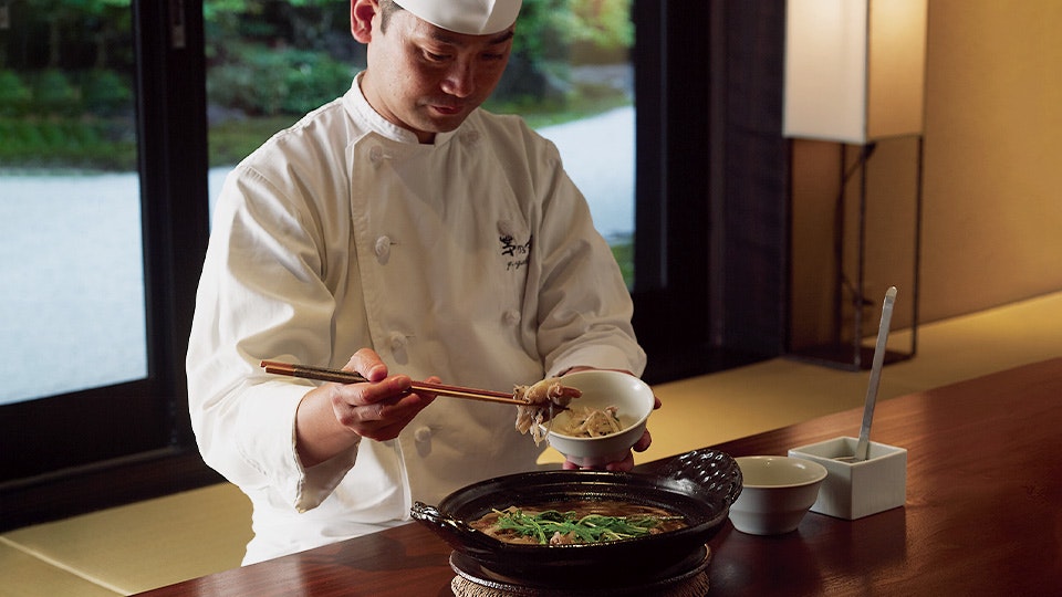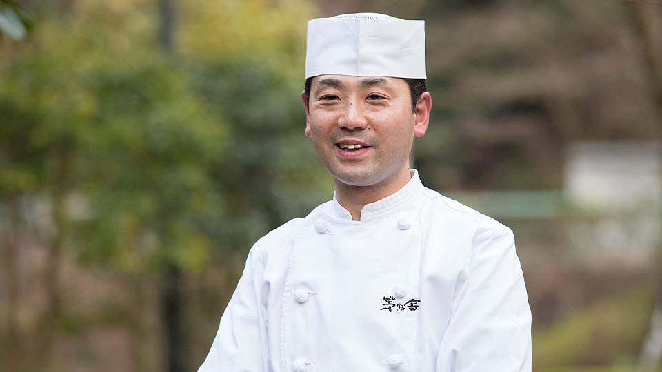 福岡の山深い里に佇む茅葺き屋根の「御料理 茅乃舎」でオープン当初より腕を振るう。和食の道20年以上の経験と知識で旬の食材を選び抜き、手間ひまかけて滋味に富む味わいを探求。