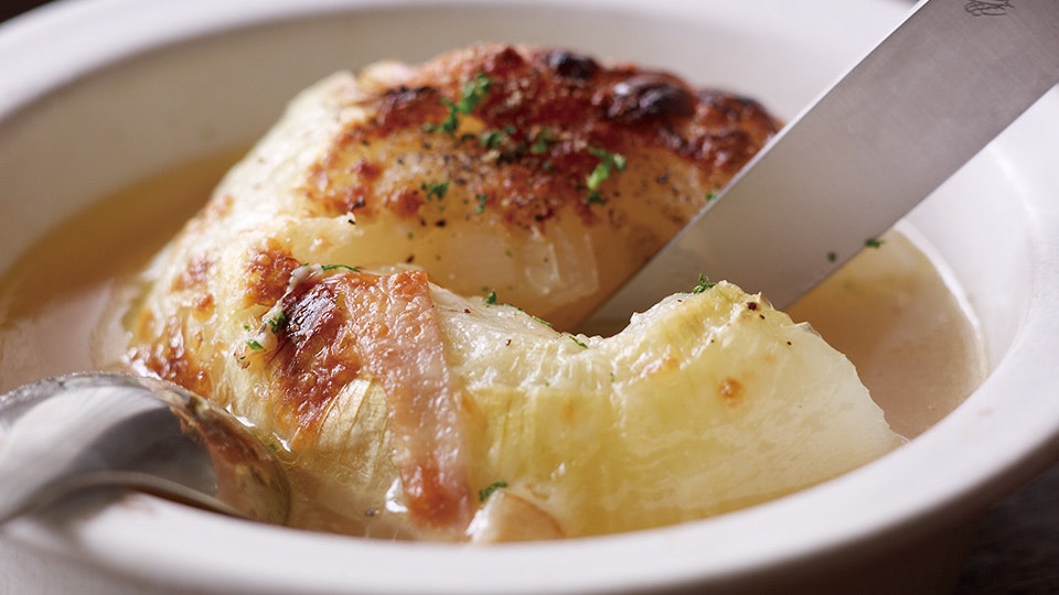 「おいしそう!」「ひたして食べたい!」と編集部でも一番人気だったこちら。深いうまみの効いた野菜だしに、丸ごと使った玉ねぎの甘み、ベーコンとチーズのコクが重なるスープは、まさにパンとの相性ぴったり。オニオングラタンスープのようにガーリックトーストをひたひたに浸していただくもよし、カリッと焼いたバゲットの上に玉ねぎを乗せて、パクリといくもよし。パンをとおして口の中にじゅわっと広がるだしの味わいを、どうぞ存分に味わってください。