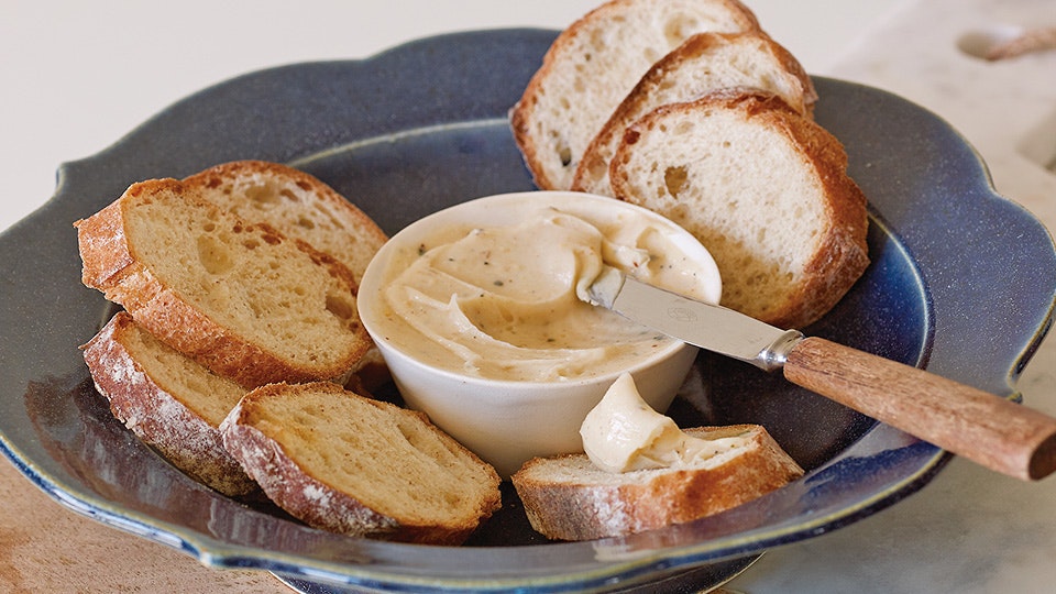 昨年、新しく茅乃舎のだしシリーズに加わった「海老だし」をご存知でしょうか。香ばしく焼き上げた国産海老に、真昆布やほたて貝柱のうまみが調和した、香り高く深い味わいです。実はこれ、バターとベストマッチであることが、レシピ開発スタッフによって発見されました。室温に戻したバターに、袋を破った海老だしを練り込むだけで、うっとりと贅沢気分に浸れるバターに早変わり。まさしく「パン泥棒」のおいしさなのです。