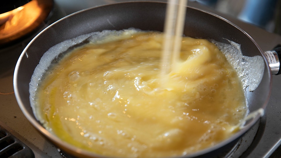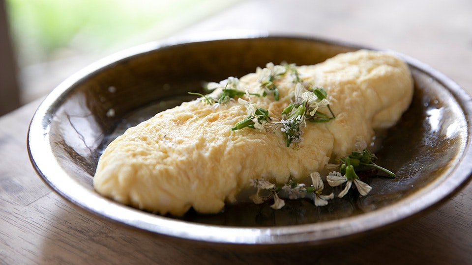 ↑ こちらは、髙木さんお手製のふるふるオムレツ。畑に咲く、ルッコラの花を添えて。