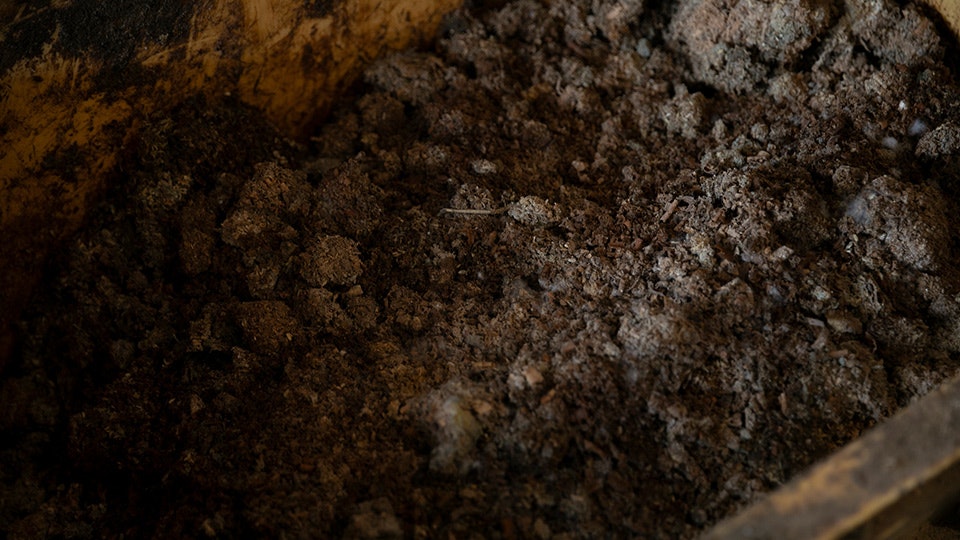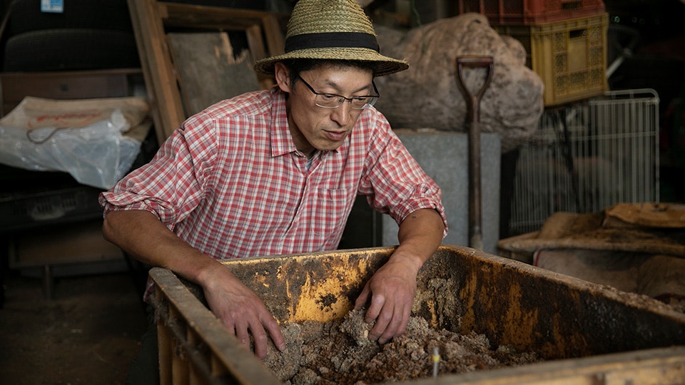 髙木さんが使うのは、つぶした大麦、ぬか、玄米、小麦、雑穀、きなこ、魚粉。そして、自分で発酵させた酵素。そこに、おからを加えてさらに二次発酵させます。すると、約60度まで温度が上がります。