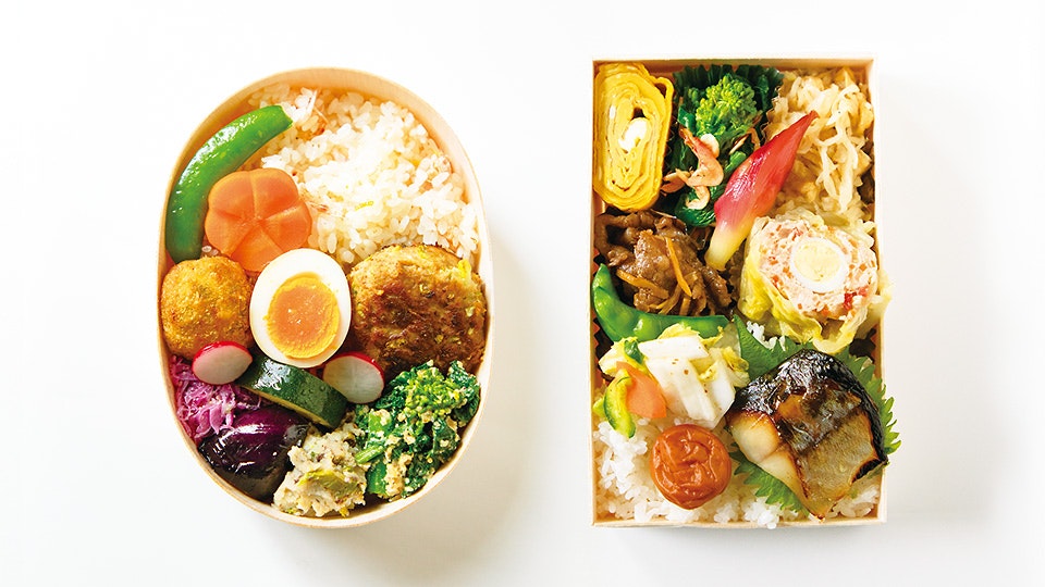 春井さんのお弁当(写真左)は、彩りと食感の楽しいおかずがぎゅぎゅっと詰められています。桜えびと柚子のごはんも特別感があっていいですね。