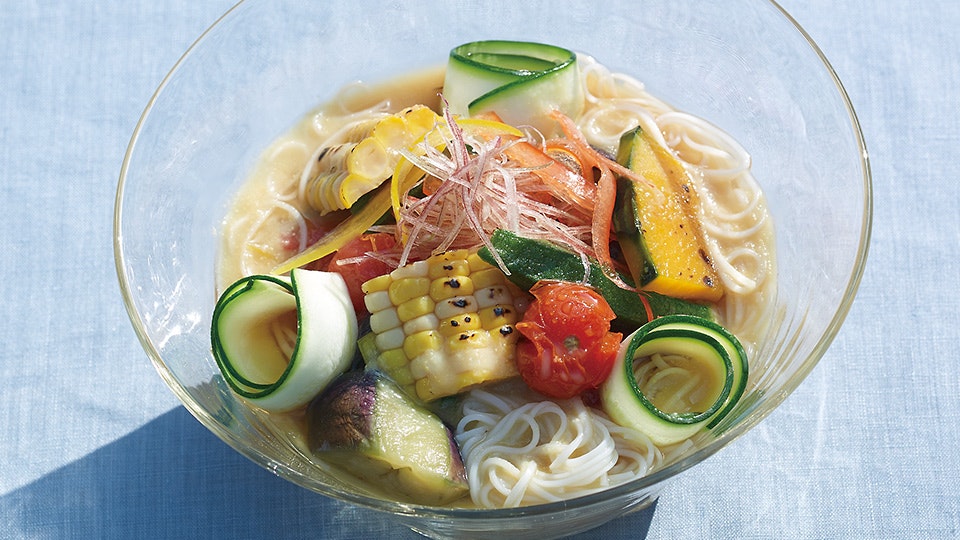 編集部からも「わぁ、おいしそう」という声が思わずもれてしまいました。「御料理 茅乃舎」尾﨑料理長が紹介する夏野菜たっぷりの素麺レシピです。涼やかで、野菜だけでこのご馳走感!
