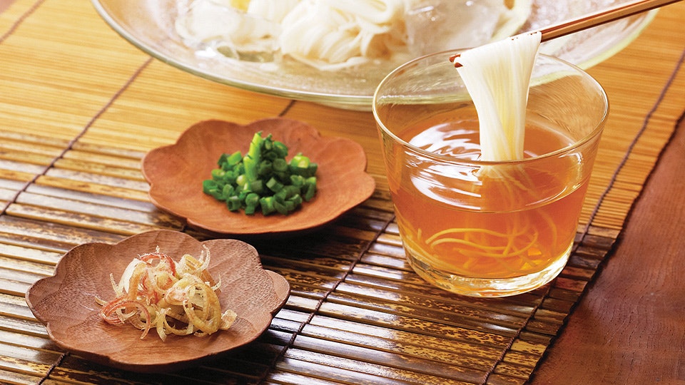 実は茅乃舎でも、夏限定で老舗『三輪山本』様に特別に誂えていただいた「寒づくり 手延べ素麺」をご用意しています。創業300年の伝統的な手延べ製法による麺は、細くてしなやか。茅乃舎「素麺つゆ」に合うよう国産小麦を厳選して作られているんですよ。つゆに浸して味わえば、だしの芳醇な香りと小麦のうまみが広がり、喉越しに涼を感じます。あ~、素麺って本当においしいなぁ。
