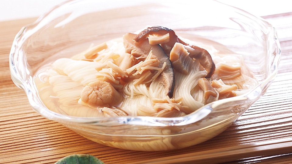 「ほたてと椎茸の具材入り 冷やしめんつゆ」は、ほたてと原木椎茸がつゆを吸っていて、うまみがジュワ〜。醤油味でさっぱりしているので、食欲がない猛暑の日でもツルっといただけますよ。
