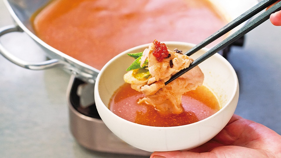 では実食いたしましょう。まずは白葱をはじめ野菜をたっぷり用意して、甘い脂の九州産黒豚と一緒にしゃぶしゃぶ。葱の食感が小気味よく、体の奥底に辛みがじんわり染みていきます。段々と十穀や具材のうまみが溶け出して、スープの味も深みを増してきましたよ。さらに「赤葱油」「辣油」の2種の薬味を加えれば、違った風味の辛さで飽きずに箸がすすみます。〆のおこわ雑炊でスープも残さずいただき、爽快な食後感。夏のダルさからシャキッと解放されそうです。