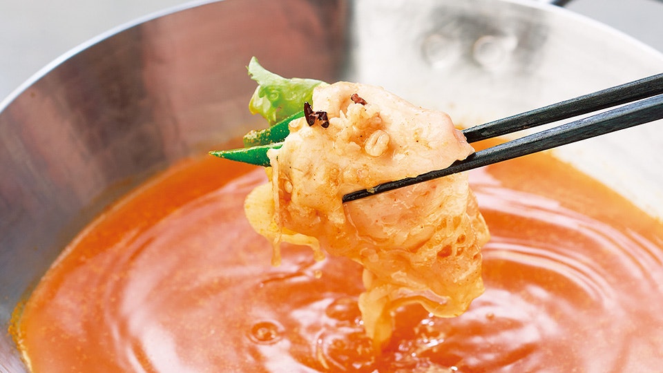 さてさて、夏のお味は? スープの色味を見るだけで、これは辛そう! だしが効いた十穀入りのスープは夕焼けを思わせる茜色です。一口いただくと、辛さの中にだしと十穀のうまみ・風味の存在感。辛くてうまい、これは大人のためのお鍋ですね。