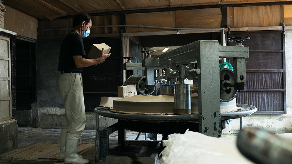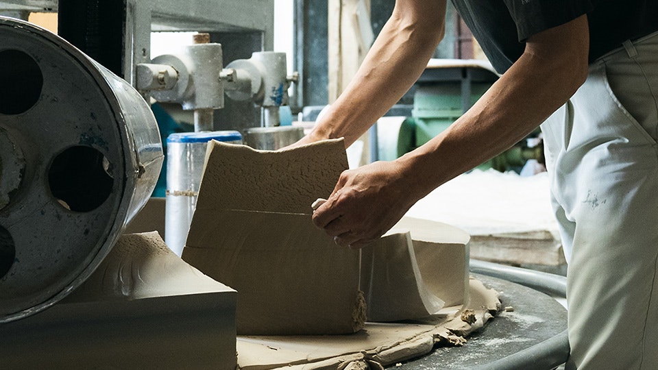 水と撹拌した磁器土をプレス機に入れ、水分を抜きます。さらに内部の空気を抜くために、練り機と脱泡機にかけます。磁器土は粘土に姿を変え、カットすると大きなチーズのような形状に。手で触るとひんやり冷たく、もっちりとした粘り気も伝わります。粘土づくりだけで1〜2週間が必要。効率性だけでは語れない仕事です。