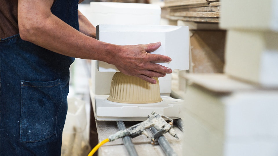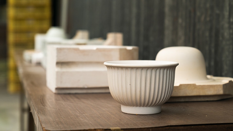 精製した粘土に水を加えて撹拌し、石膏型に流し込みます。圧力をかけて1時間半ほどで、粘土は石膏型から外せる状態に。この製法を用いたとき、石膏型の耐久回数はわずか70回ほど。原型そのままに形状を再現するためには、絶えず新しい石膏型が必要になるのです。