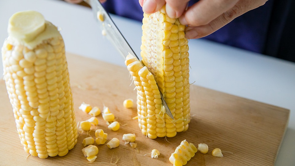 まずは、とうもろこしの実を取り除きます。「包丁で半分に切ってからそぐと安定しますし、実もきれいに取れます」