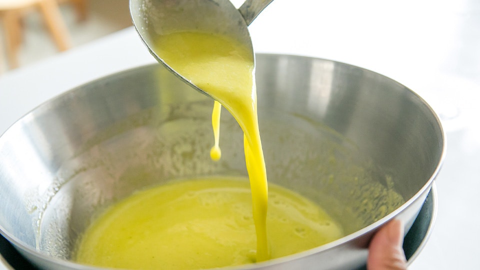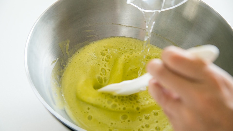 水を加え、冷やして完成。「氷水を張ったボウルに当てて回すのが、一番早く冷やす方法。そのほうが色も悪くなりにくいので」