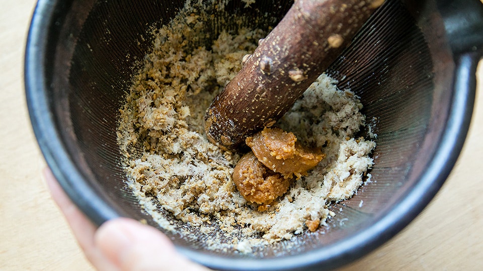 「冷や汁は、すごいつくります。つくり方もかんたんなんです。焼いたあじの干物の骨と皮を取り除いてほぐし、すり鉢で軽くすり混ぜてから、煎り白ごま大さじ1、麦味噌小さじ2、昆布だしを破って入れ、さらにすり鉢でぐりぐりと混ぜ合わせます。