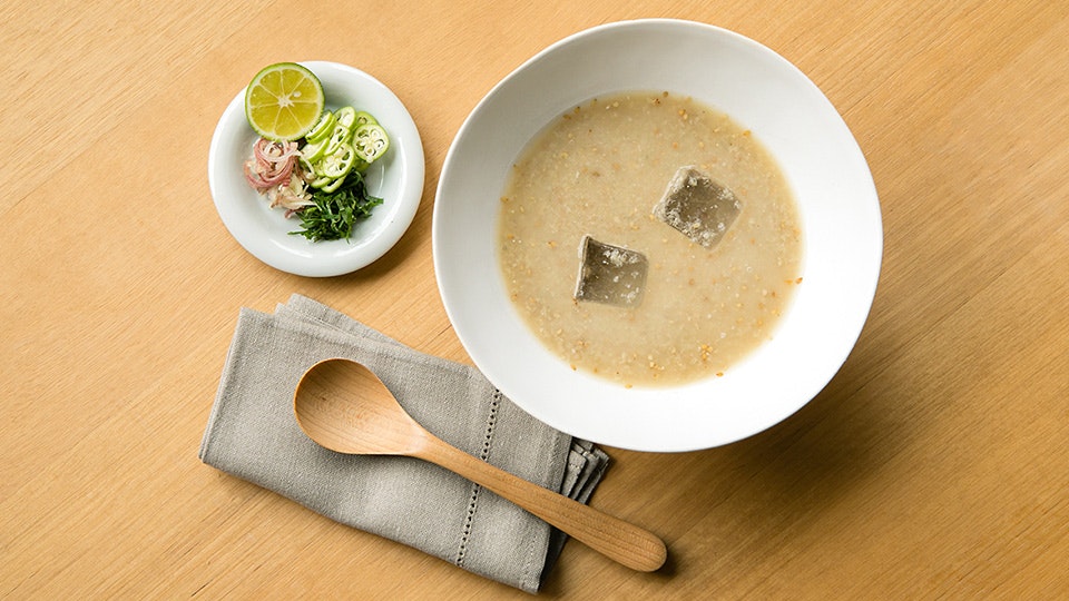 最後、水200〜300mlで伸ばせばできあがりです。青しそ、オクラ、茗荷など薬味を刻み、すだちも一緒に添えて。ごはんは入れないで、スープだけで楽しむこともあれば、そうめんや豆腐を入れるときもあったり。その日の気分で変わります」