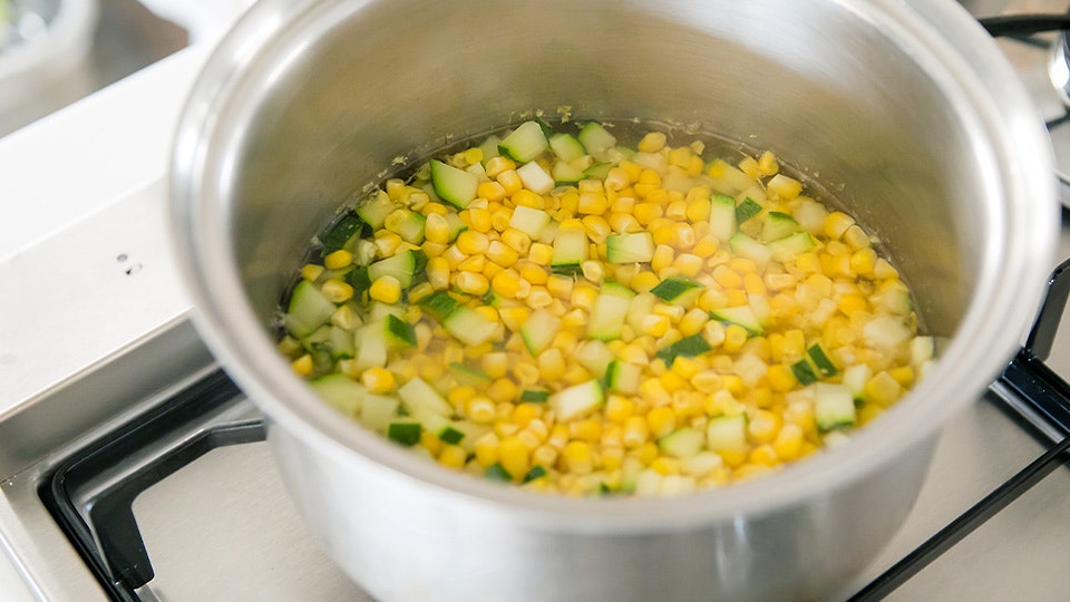 ということで、まずは定番のコーンスープを作っていただきます。とうもろこしだけでなく半分をズッキーニにすることで、さらっとみずみずしく仕上げます。