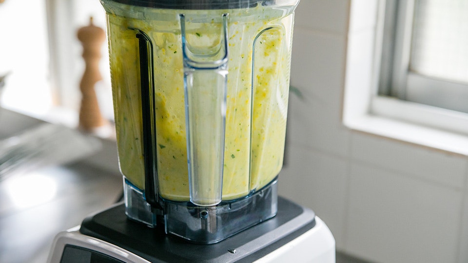 ミキサーにかけて攪拌します。「もしくはミキサーにかけなくても、ズッキーニをもう少し小さく切って、食べるスープみたいにしてもおいしい」