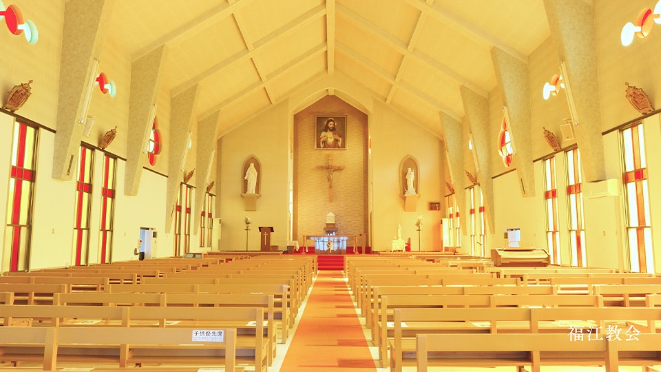 厳しい弾圧により、江戸後期に多くのキリシタンが五島に移住してきました。すでに住民がいた五島で、キリシタンたちは必然的に無人の海沿いや傾斜地など、厳しい環境に住まざるをえないことも多かったといいます。信徒たちは畑や漁で財を蓄え、ときには自分たちで石をひとつずつ運び、小さな教会を建ててきました。今でも五島には50もの教会堂が現存しています。