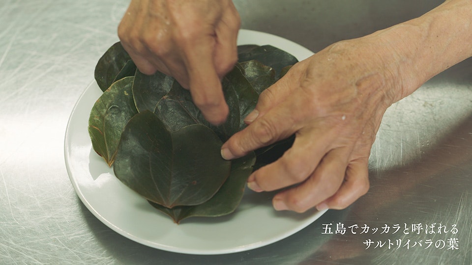 五島のふくれもちに欠かせないのが、おもちの下にひくカッカラの葉(学名はサルトリイバラ)。丸い形がかわいらしく、表面がツルツルしているので、ふくれもちを乗せるのにぴったり。庭や道端にも生えていて、春先に出る芽はほんのり酸味と粘り気があって、子どもの頃のおやつでもあったそうです。