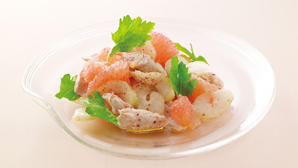 フルーツサラダ=おしゃれ=ハードルが高い。と思ってしまうのは、私たちだけでしょうか?それゆえになんとなく敬遠してしまっているなら、今日を境目に、私たちと一緒にその考えを卒業しましょう。田原が選んでくれたフルーツサラダは、そんな「ファーストフルーツサラダ」に、とてもおすすめの一品。なぜならセロリ×ささ身×グレープフルーツ。この3つの相性が、驚くほど最高によい組み合わせだから。さらに茅乃舎だしが全体をしっくりとまとめ、きっとまた作りたくなる味に仕上がる、ということなのです。