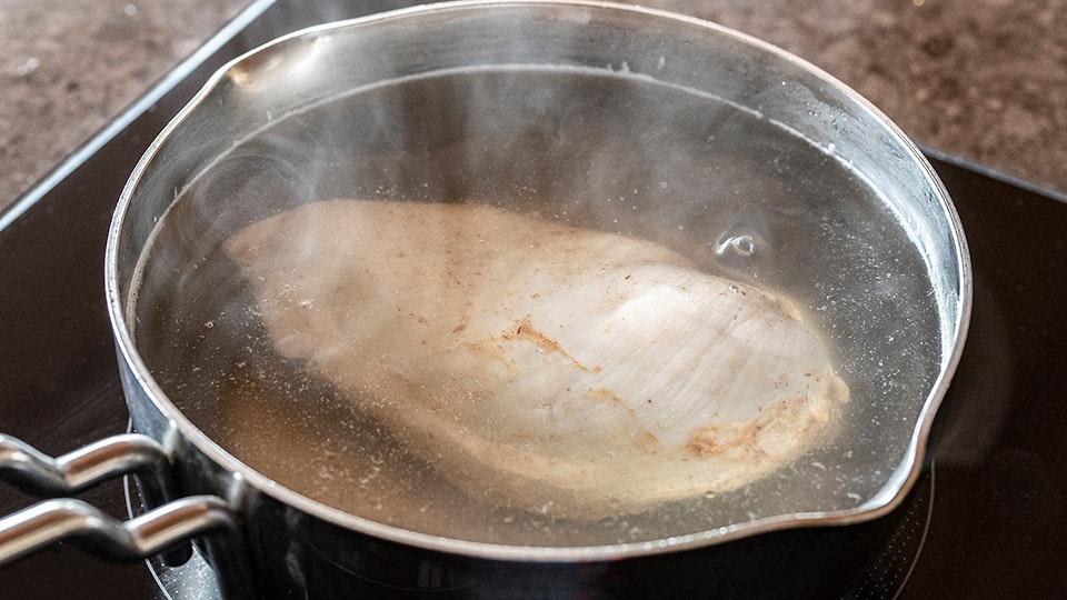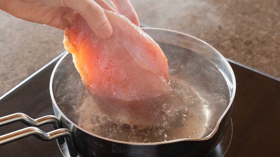 沸騰する前に鶏肉を入れて、再沸騰したら中火にし、約1分30秒茹でます。