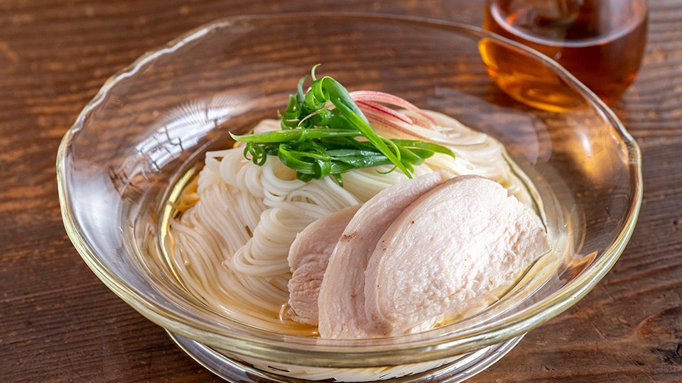 その人気レシピが、「茅乃舎だしでつくる鶏ハム」です。加える調味料は、砂糖・塩のみ。一晩置いてから茹でるだけで、しっとりとした鶏ハムができあがり。
