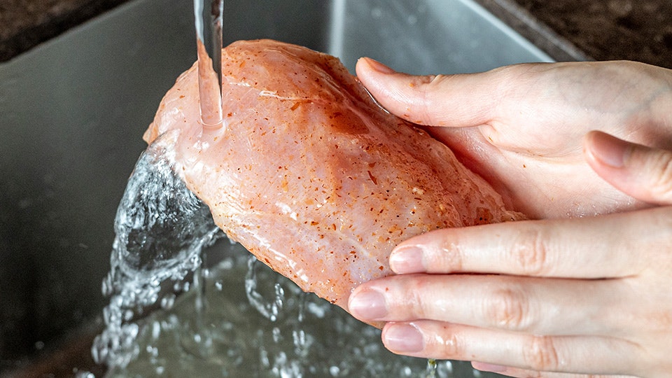 翌日、取り出した鶏肉を流水で洗い流します。この段階ではまだ塩気があるので、しっかりと洗い流してください。